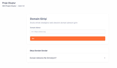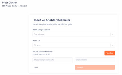 SEO projeniz için hedef ülke, anahtar kelime ve URL bilgilerini girin. KAF, analizlerini bu bilgilere göre optimize eder.